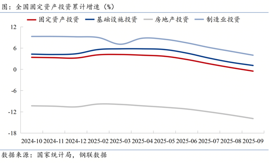 ◎ 1-9月,全國固定資產(chǎn)投資(不含農(nóng)戶)371535億元,同比下降0.5%。分領(lǐng)域看,基礎(chǔ)設(shè)施投資同比增長1.1%,漲幅較1-8月回落0.9個百分點(diǎn)。制造業(yè)投資增長4.0%,較前8個月回落1.1個百分點(diǎn)。房地產(chǎn)開發(fā)投資下降13.9%,降幅較1-8月擴(kuò)大1.0個百分點(diǎn)。全國新建商品房銷售面積65835萬平方米,同比下降5.5%;新建商品房銷售額63040億元,下降7.9%。