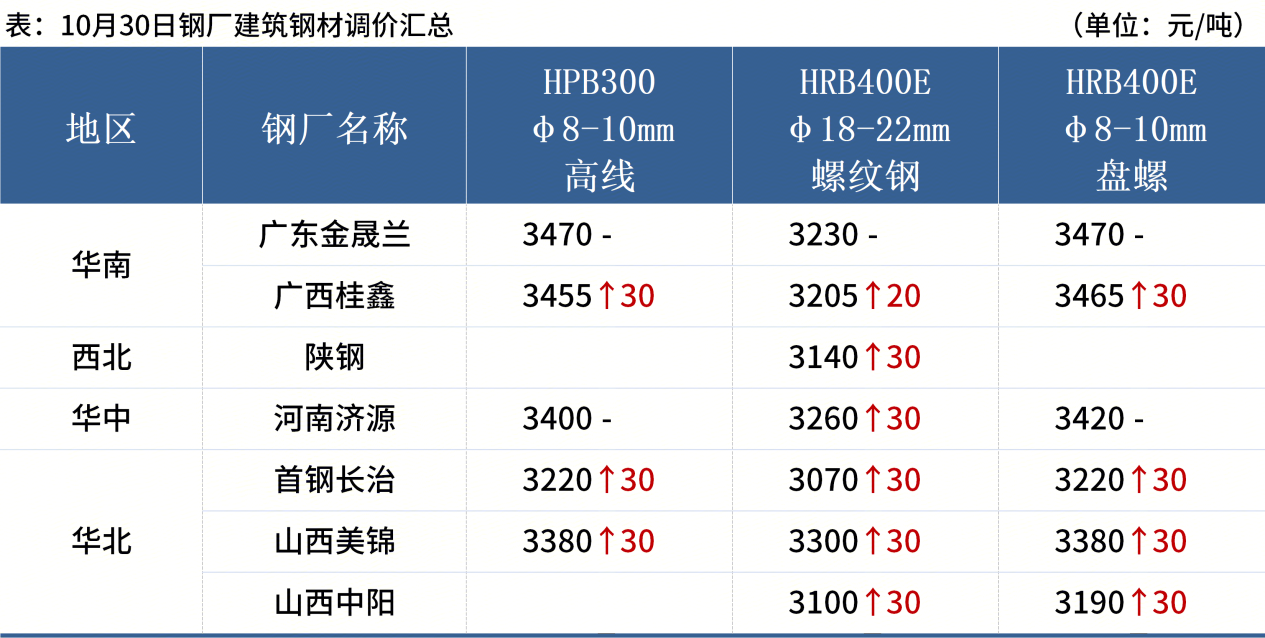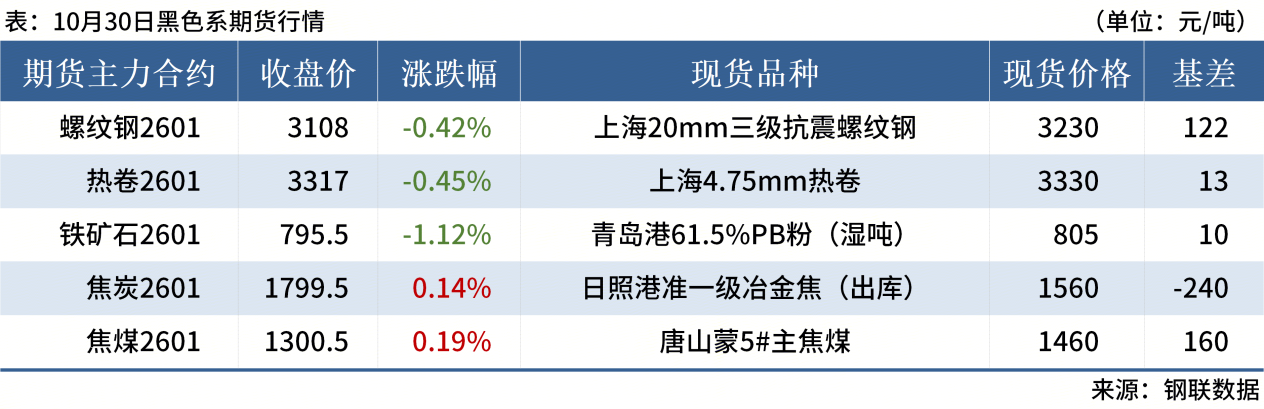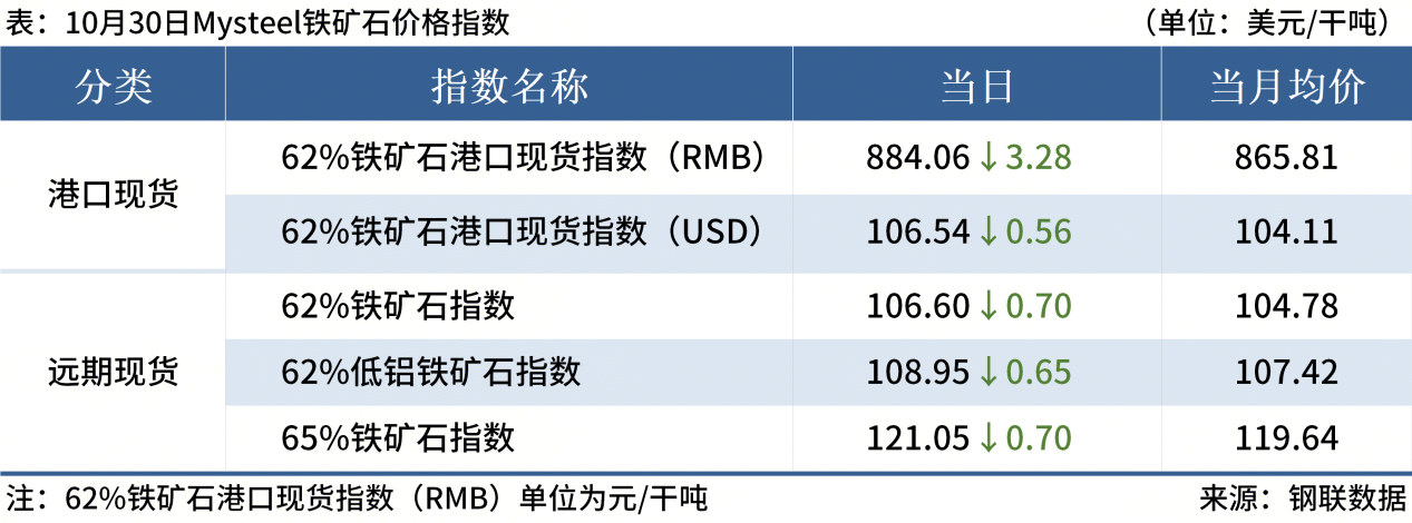 ◎ 10月30日,全國(guó)主港鐵礦石成交74.00萬噸,環(huán)比減22.2%;237家主流貿(mào)易商建筑鋼材成交9.02萬噸,環(huán)比減21.3%。