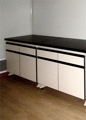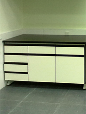 組成構件 1、臺面板: 臺面板采用16mm環(huán)氧樹脂板。 2、柜體: 柜體采用18mm厚國家一級三聚氰胺雙貼面中密度成型板制作。柜門及抽屜面采用2mm厚PVC封邊條封邊,所有封邊連接處均做圓弧過渡處理。